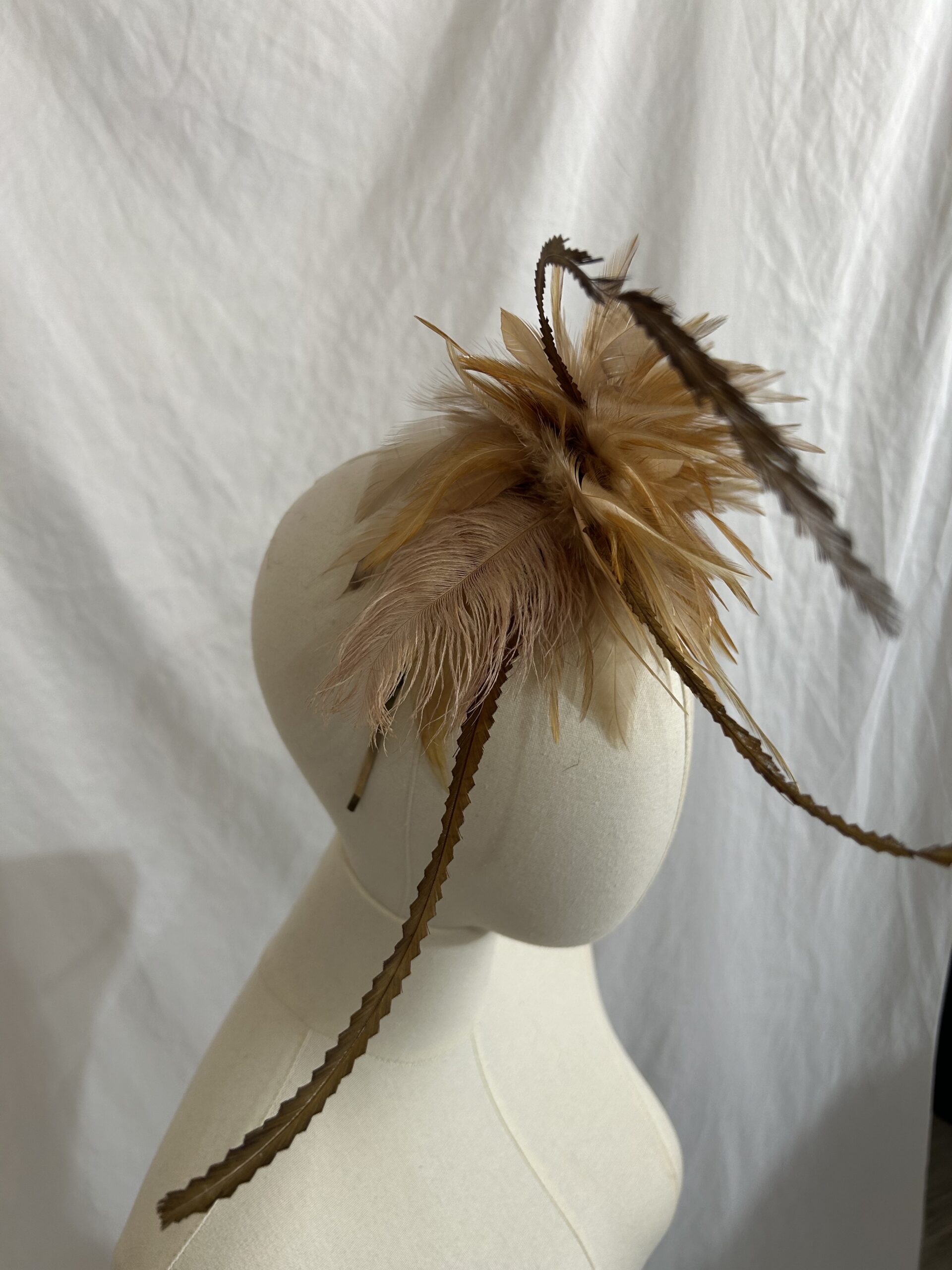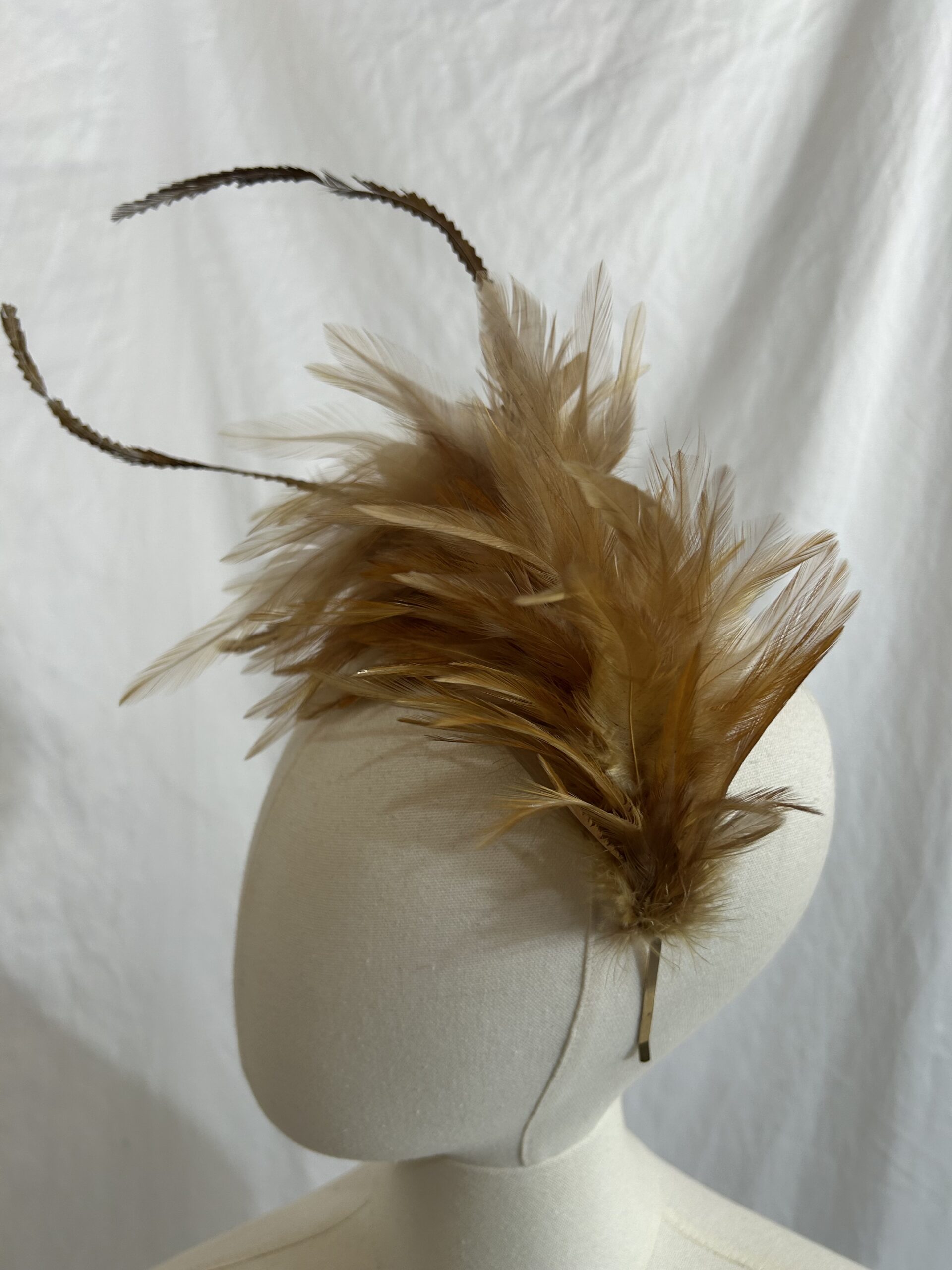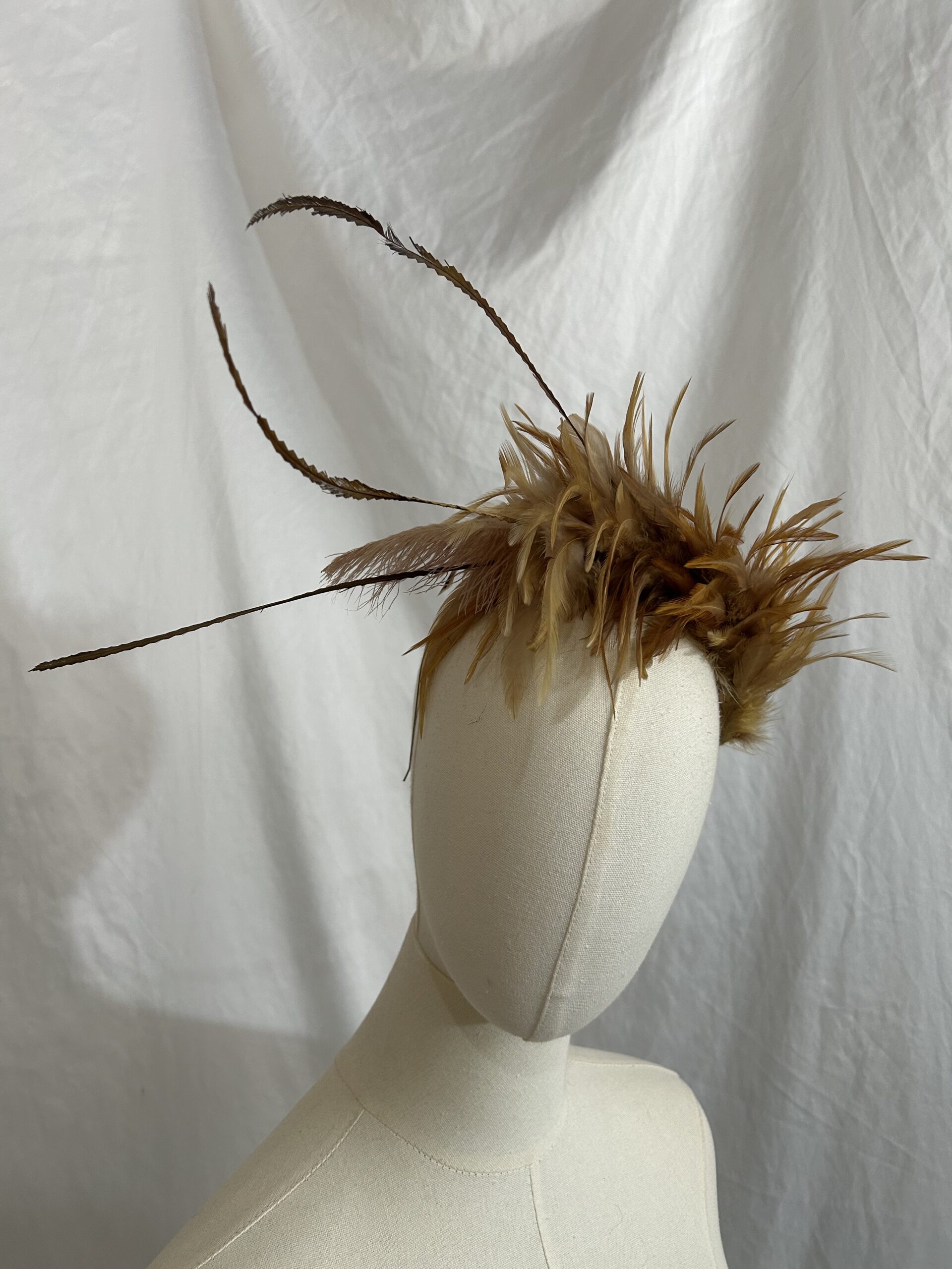 Tocado artesanal de plumas en tonos tierra, diseñado para aportar un toque sofisticado y vanguardista a cualquier look. Esta pieza destaca por su composición orgánica de plumas en marrones cálidos y ocres, con delicadas plumas alargadas que aportan movimiento, altura y carácter.